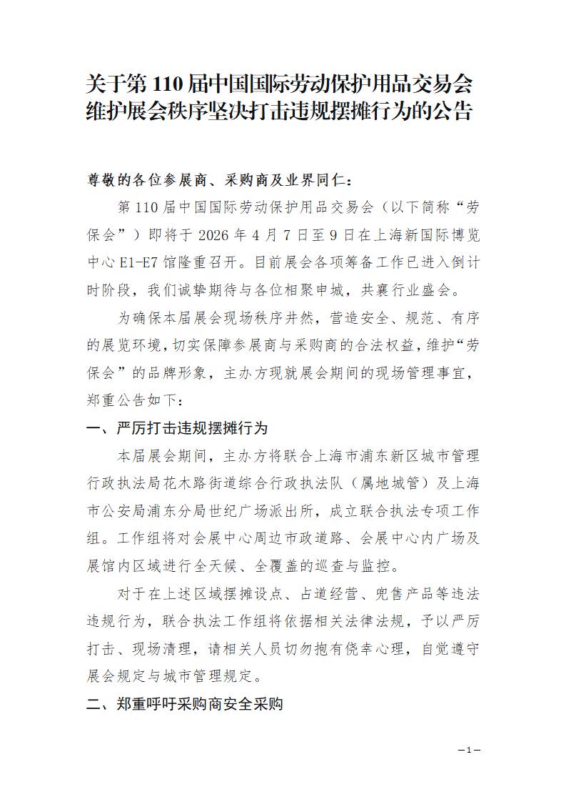 為確保本屆展會(huì)現(xiàn)場秩序井然,營造安全、規(guī)范、有序的展覽環(huán)境,切實(shí)保障參展商與采購商的合法權(quán)益,維護(hù)“勞保會(huì)”的品牌形象,主辦方現(xiàn)就展會(huì)期間的現(xiàn)場管理事宜,鄭重公告如下: