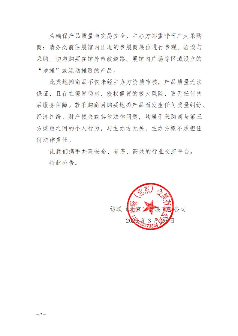 此類地?cái)偵唐凡粌H未經(jīng)主辦方資質(zhì)審核,產(chǎn)品質(zhì)量無法保證,且存在假冒偽劣、侵權(quán)假冒的極大風(fēng)險(xiǎn),更無任何售后服務(wù)保障。若采購商因購買地?cái)偖a(chǎn)品而發(fā)生任何質(zhì)量糾紛、經(jīng)濟(jì)糾紛、財(cái)產(chǎn)損失或其他法律問題,均屬于采購商與第三方攤販之間的個(gè)人行為,與主辦方無關(guān),主辦方概不承擔(dān)任何法律責(zé)任。
